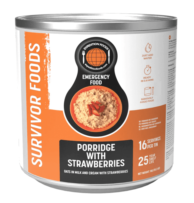 The Expedition Foods Freeze Dried Meal Tin Porridge With Strawberries - 16 Servings is a delicious way to start the day, with enough servings for the whole family! Freeze dried to lock in all of the flavours and nutrients, this meal tin from Expedition Foods will last for 25 years - making it the ideal addition to your long term survival supplies! All you have to do is add boiling water, wait for 5-8 minutes and you will have a warm and tasty bowl of porridge which will kick start your day. These tins are specifically designed to be lightweight and easy to store, allowing you to survive and thrive in any emergency.