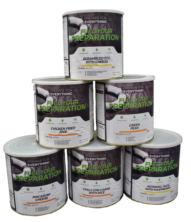 The Fuel Your Preparation 1 Month Freeze Dried Ration Meal Kit - 79 Servings contains enough food for almost three servings a day for a whole month! Providing you with a delicious, nutritious and hearty meal every meal time are these freeze dried rations from Fuel Your Preparation. Freeze dried to lock in all the flavour and nutritious values, all you have to do is add boiling water and wait 10 minutes. Not only this, but these tins are designed to last for 25 years making them the perfect addition to your long term survival supplies. Look forward to breakfast, lunch and dinner each day with this 1 month freeze dried meal kit!