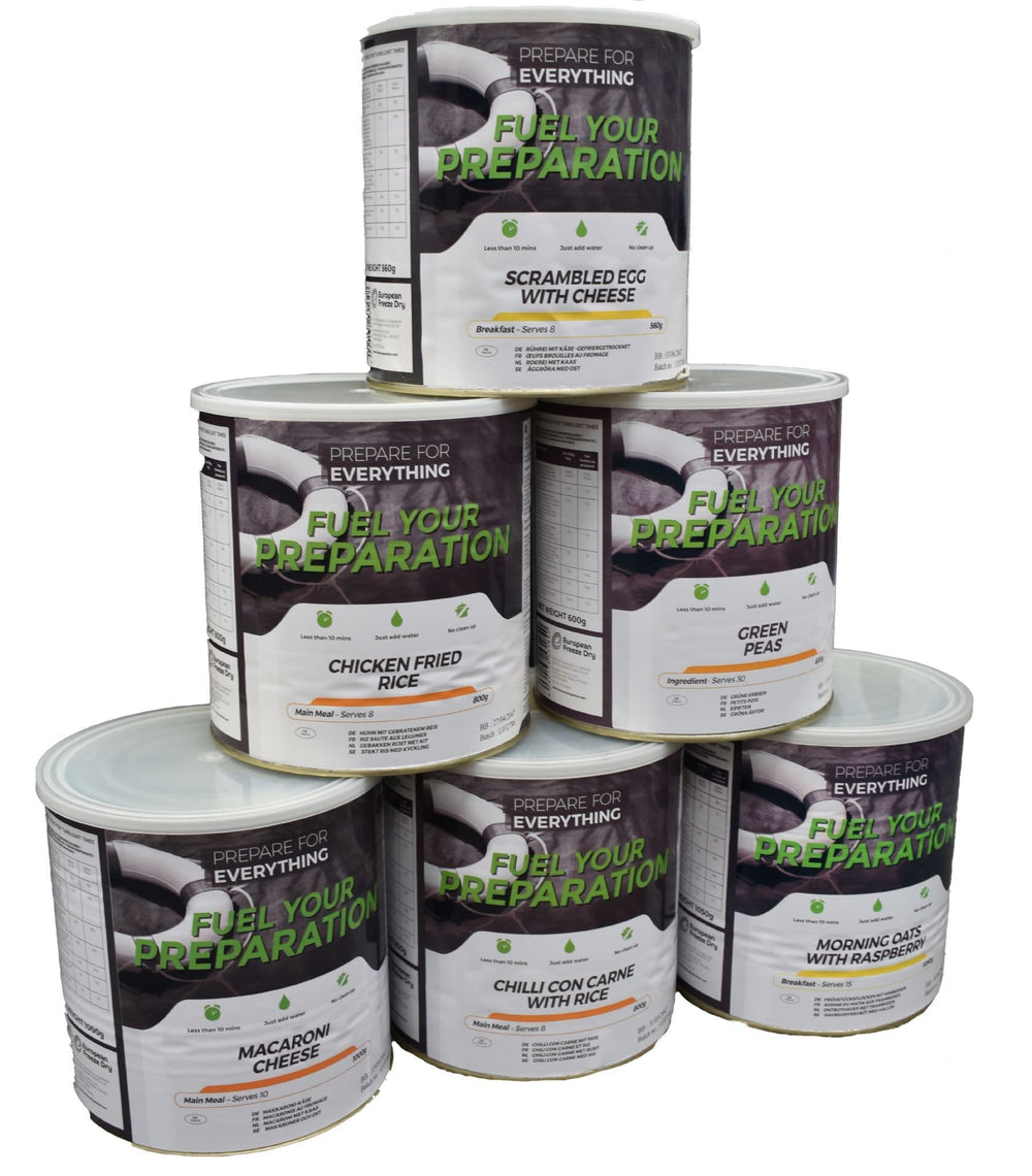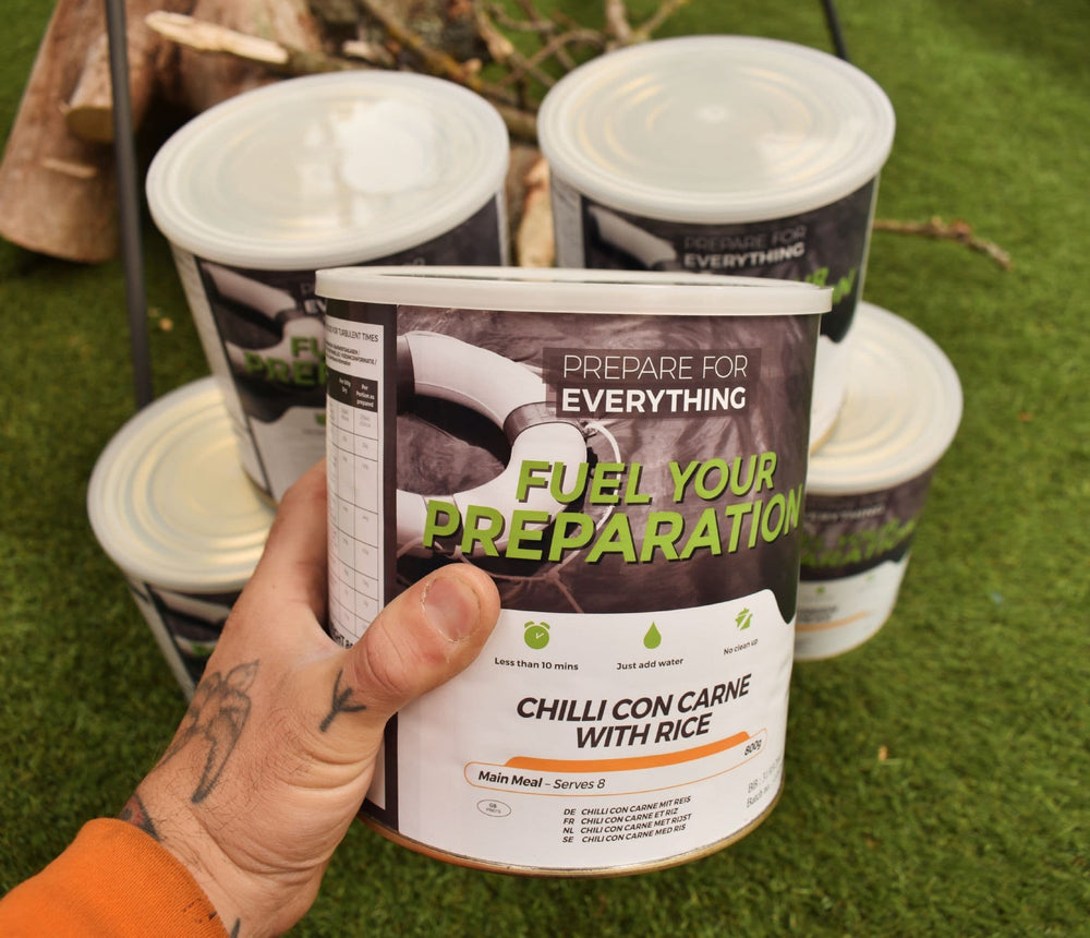 - 1 x Fuel Your Preparation Freeze Dried Food Ration Meal Tin - Chilli Con Carne With Rice or Fuel Your Preparation Freeze Dried Food Ration Meal Tin - Vegetable Chilli With Rice - 8 Servings