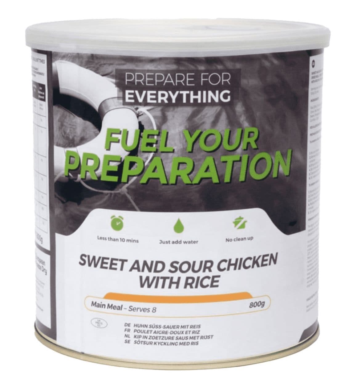 The Fuel Your Preparation Freeze Dried Food Ration Meal Tin - Sweet and Sour Chicken With Rice is a great twist on your favourite takeaway classic. These 800g tins contain eight 100g portions and are so easy to prepare, simply add water, wait for 10 minutes and you will have a delicious, nutritious and hearty meal that the whole family will love! With a shelf life of 25 years, this is the ideal addition to your long term survival supplies.