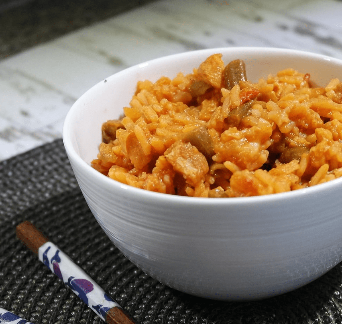 Rice (28%), Vegetables ( Peppers, Onions, Green Beans), Cooked Chicken (16%), Pineapple Pieces, Malt Vinegar (Barley),Tomato Puree, Rapeseed Oil, Sugar, Garlic, Salt, Cornflour.