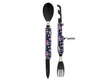 • Includes a large spoon, a 5-pronged fork, a knife with a micro-serrated blade, a 4-spiral corkscrew, a can opener, and a bottle opener