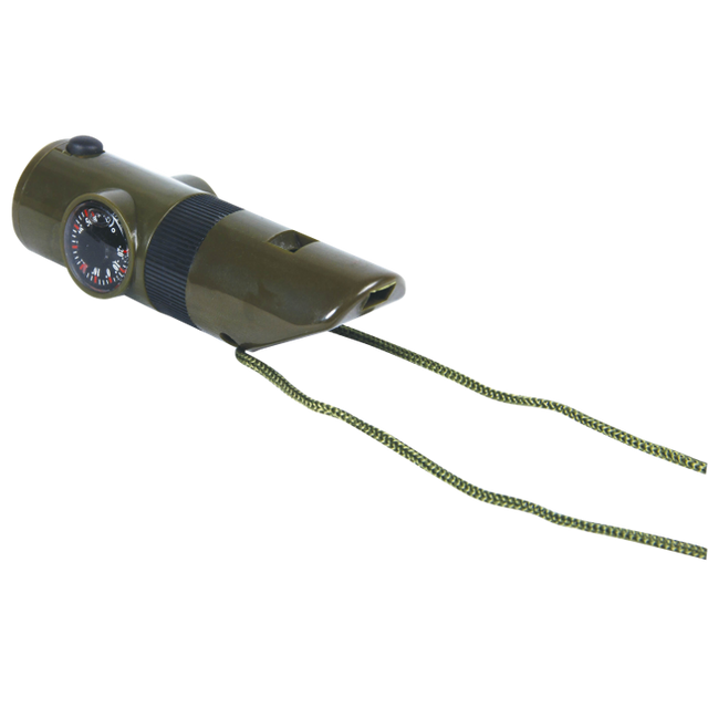 • Features whistle, thermometer, compass, magnifying glass, signal mirror, storage container, and LED light