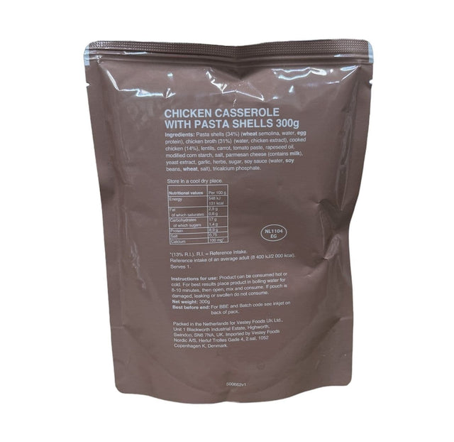 The British Military Ration Main Meal Pouch - Chicken Casserole With Pasta Shells 300g are great for outdoor use or alternatively stocking up your long term survival supplies! These pouches were originally designed for use within the British military, thus are perfectly nutritionally balanced for survival purposes. You can eat them cold straight from the bag or boil in the bag for a quick and easy meal within minutes!