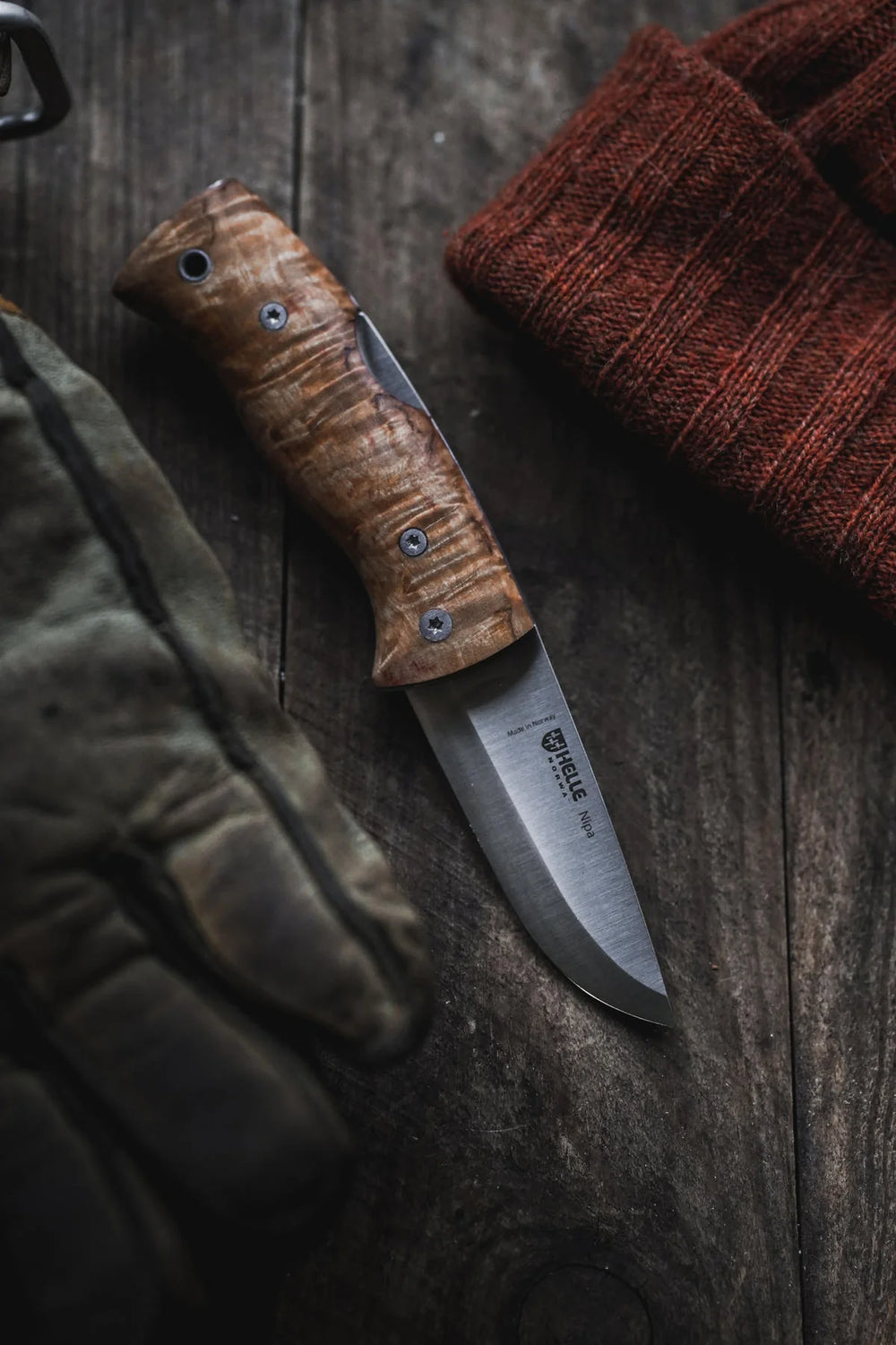 Step into the future of cutting tools with the innovative Helle Nipa Folding Lock Knife. This modern interpretation of the classic Kletten folding knife boasts a larger design that elevates its utility to new heights. Meticulously crafted with a beautifully hand-sanded curly birch wooden handle, this knife embodies a perfect blend of durability and functionality. Its ergonomically designed handle offers a comfortable four-finger grip, tailored for users with medium-sized hands to ensure a secure hold with every use.