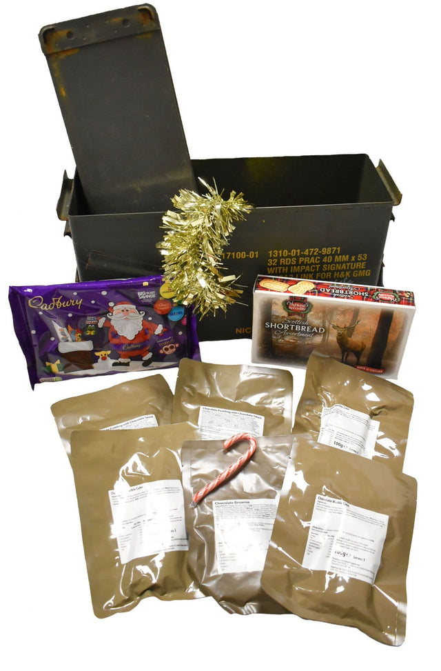 The British Military 40mm Dessert Ration Hamper is the ultimate gift for any prepper with a sweet tooth. Filled with a range of British Military dessert ration pouches, this allows the receiver to try a variety of different sweet treats which were originally offered to the army. These meal pouches come complete in a British Military PA120 40mm ammo box which is ideal for storing tools, prepping supplies, outdoor gear and more! The best part is, these ammo boxes are fully waterproof.