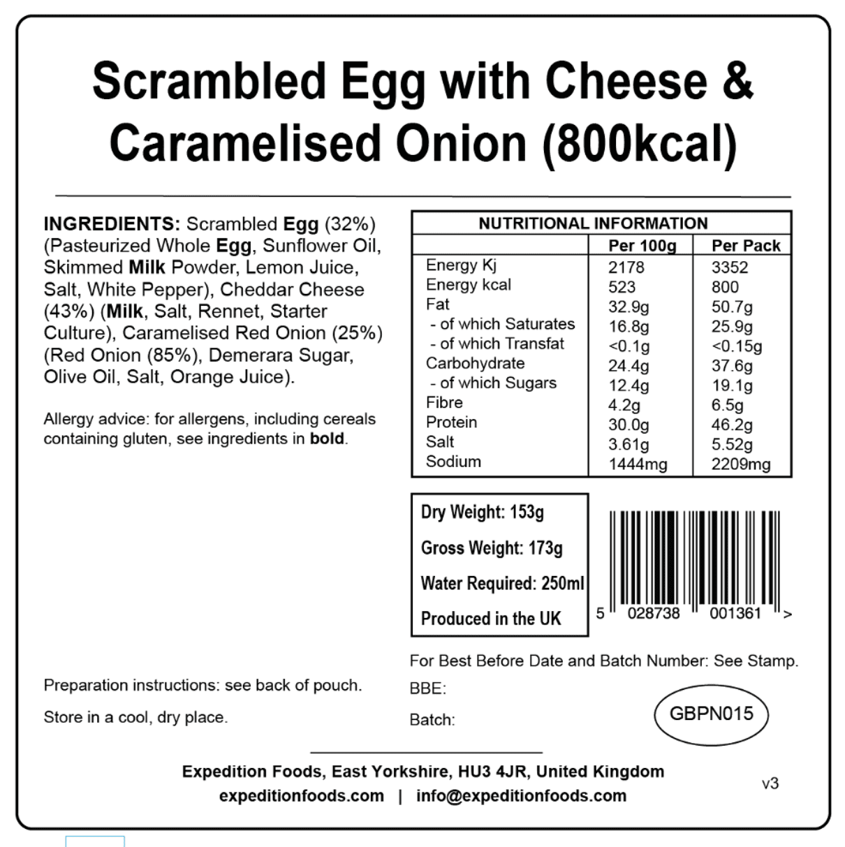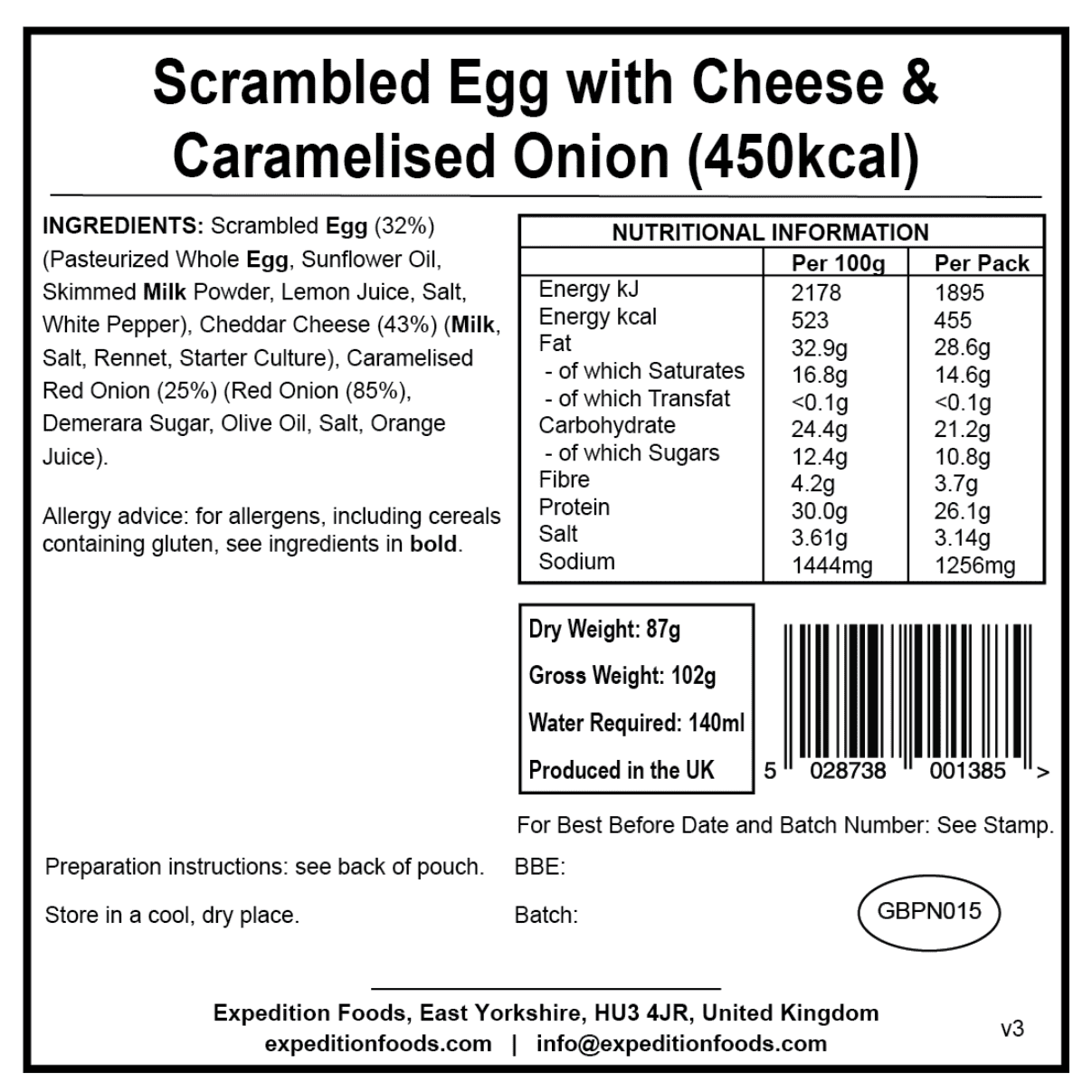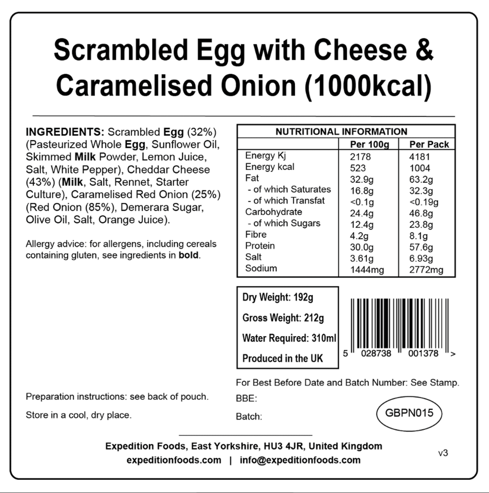 Expedition Foods Freeze Dried Meal Pouch - Scrambled Egg, Cheese & Caramelised Onion - Various Sizes