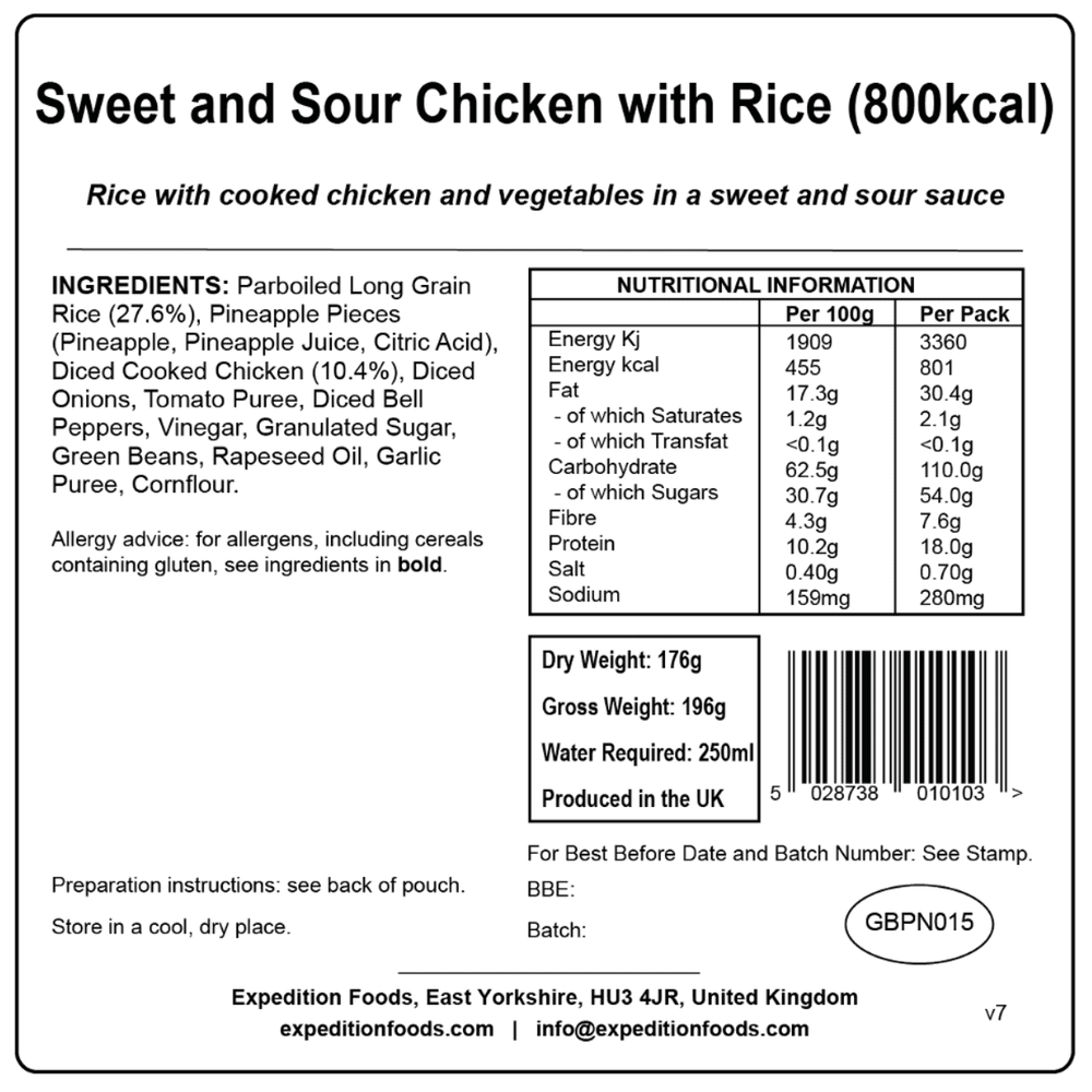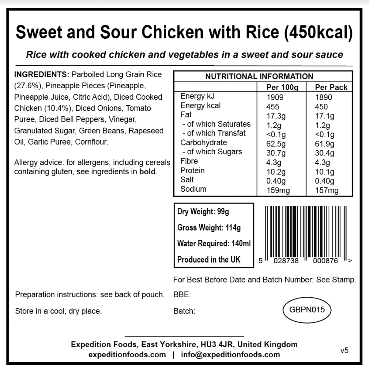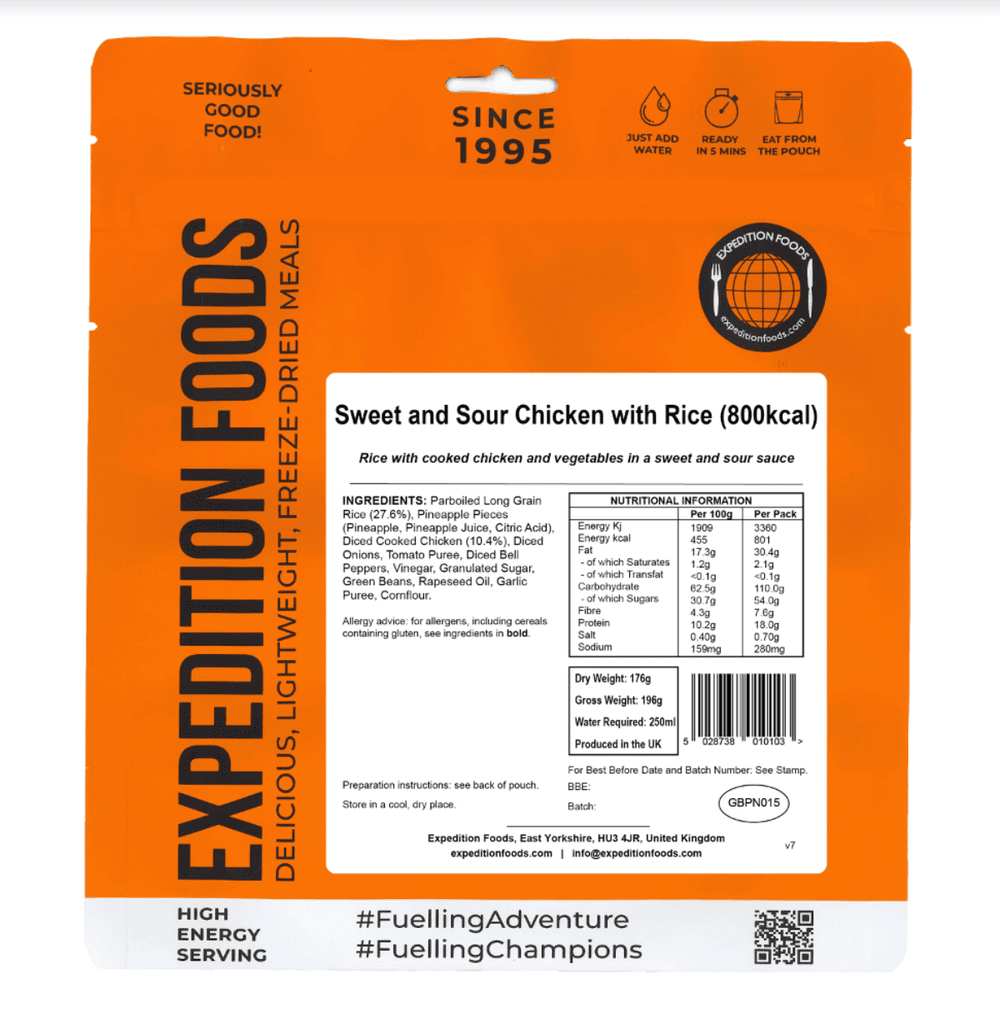 The Expedition Foods Freeze Dried Meal Pouch - Sweet And Sour Chicken With Rice - Various Sizes have been made from the highest quality products to provide you with a lightweight, yet nutritious and delicious meal whilst out in the wilderness. Whether you are out camping, hiking, climbing or more, these meal pouches from Expedition Foods are available in three different sizes and have a shelf life of over 4 years making them the perfect addition to your bug out bag.